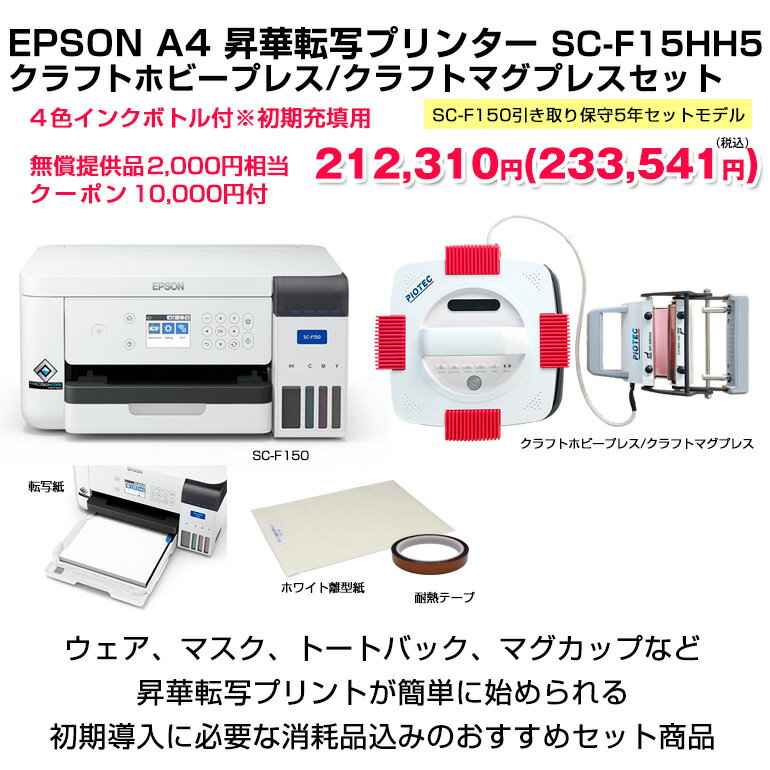 ■商品エプソン | EPSON 昇華転写プリンター SC-F15HH5 ( SC-F150引き取り保守5年セットモデル ) クラフトホビー/マグプレスセット SureColorシリーズの新商品 A4サイズ対応 昇華転写 オリジナルプリント オリジナルグッズ マスク マグカップ Tシャツ タオル※昇華用熱プレス機『クラフトホビープレス / マグプレス』とのセット商品です。