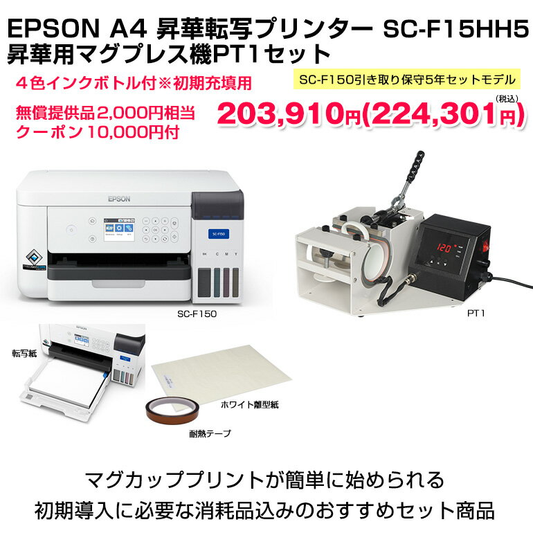 ■商品エプソン | EPSON 昇華転写プリンター SC-F15HH5 ( SC-F150引き取り保守5年セットモデル )マグカッププレス機PT1セット SureColorシリーズの新商品 A4サイズ対応 昇華転写 オリジナルプリント オリジナルグッズ マスク マグカップ Tシャツ タオル※昇華用マグカッププレス機『PT1-B 11ozヒーター付』とのセット商品です。
