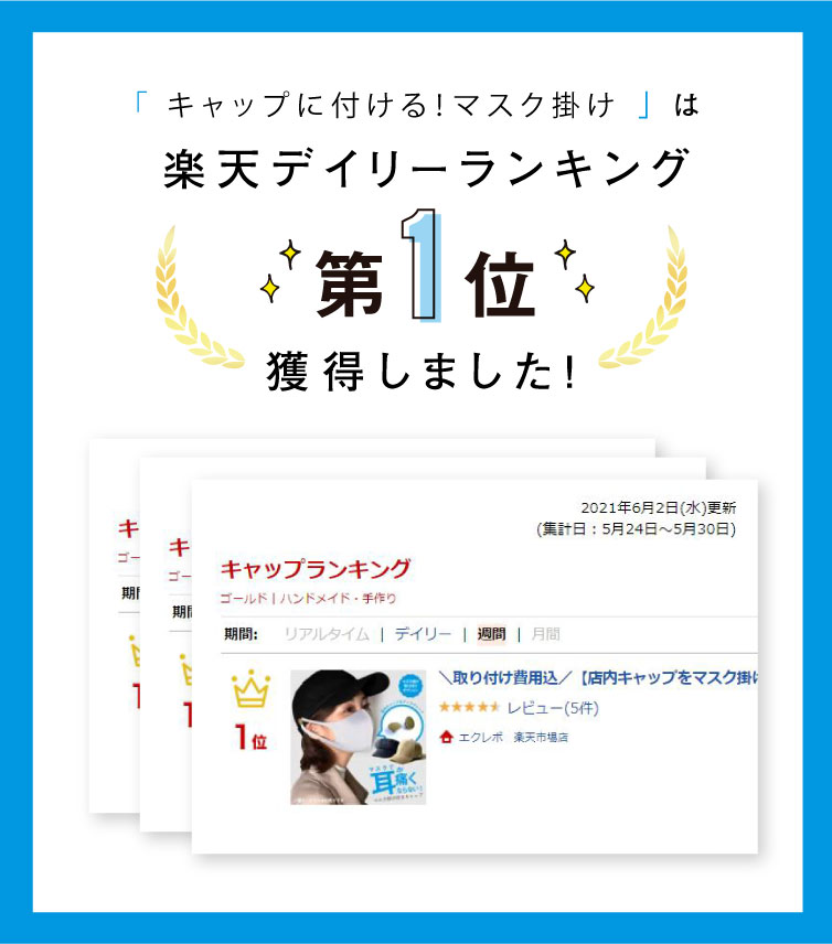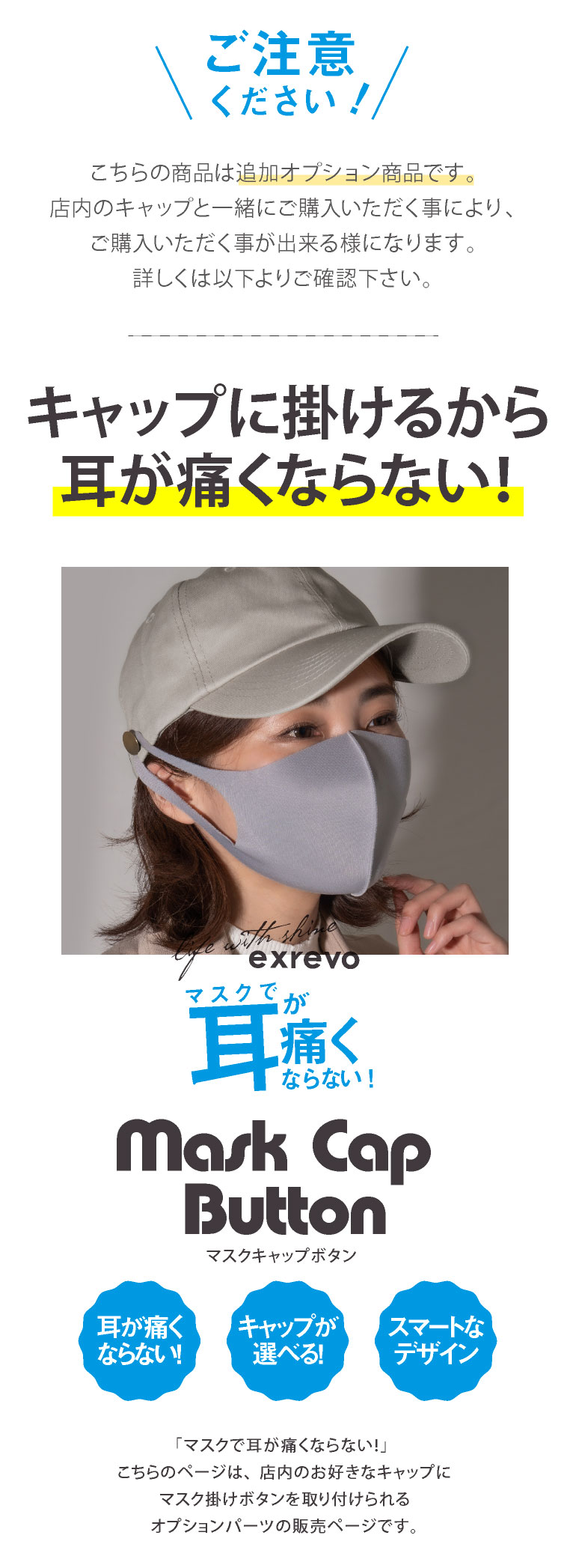 「マスクで耳が痛くならない!」 こちらのページは、店内のお好きなキャップに マスク掛けボタンを取り付けられるオプションパーツの販売ページです。
