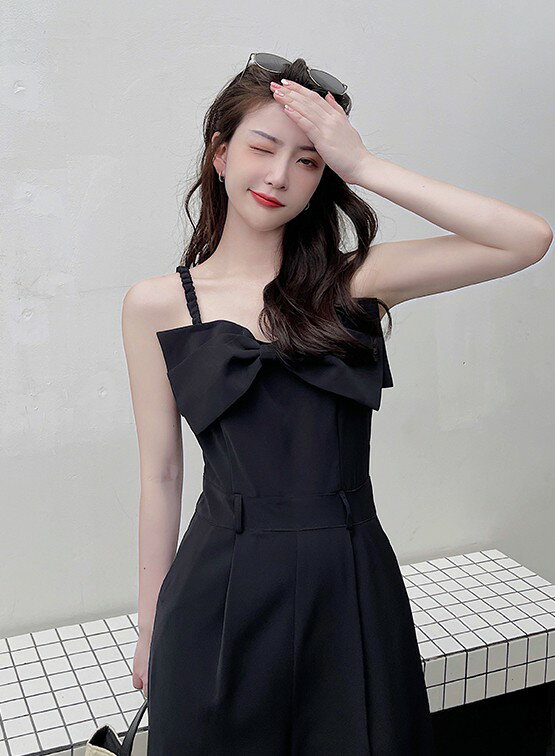 オールインワン サロペット レディース パンツ 春 夏 秋 ジャンプスーツ 韓国 ファッション シンプル カジュアル おしゃれ 大人可愛い ビッグリボン キャミサロペット 黒 ブラック