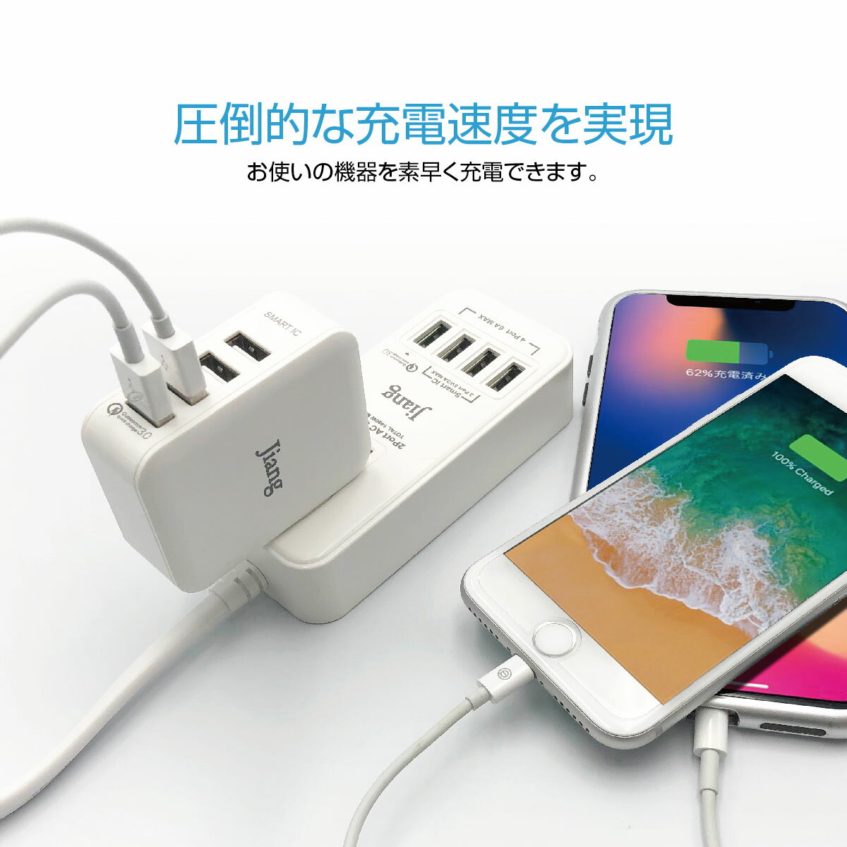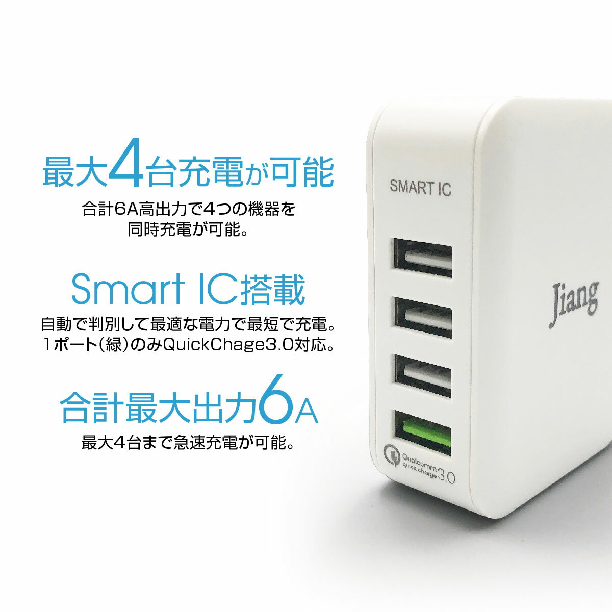 ACアダプタ 4ポート USB 充電器 チャージャー PSE認証 USB充電器 6.0A 4口 コンセント Quick Charge 3.0 電源タップ 同時充電 AC アダプター iphone android jiang-ac03